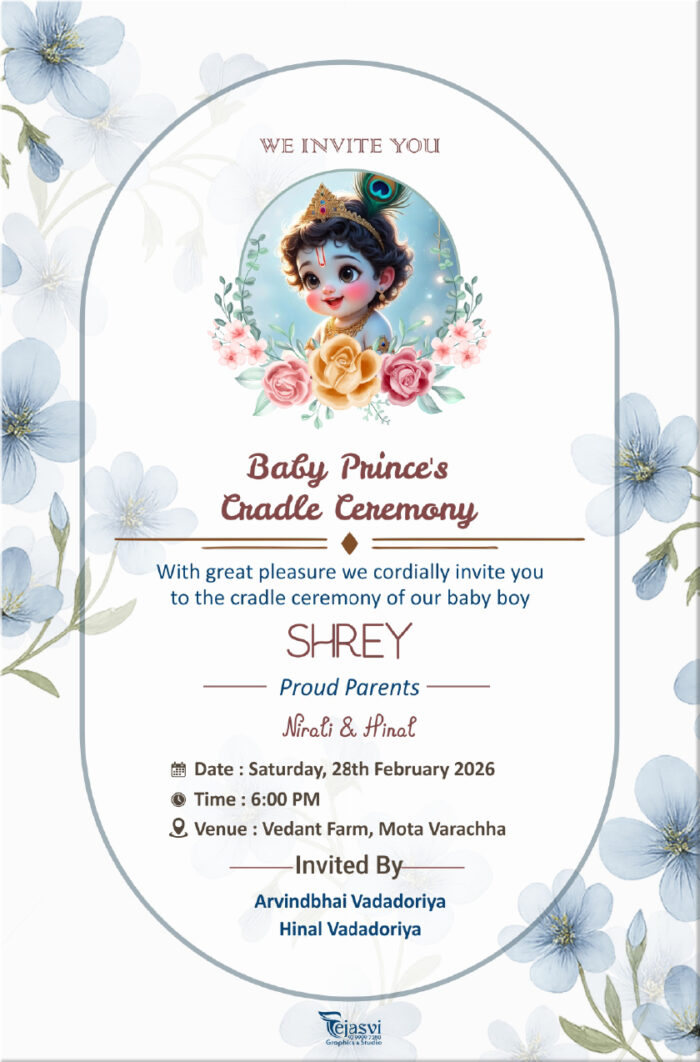 Elegant Baby Cradle Ceremony Invitation Card with Cute Krishna & Floral Theme LADVA2026007