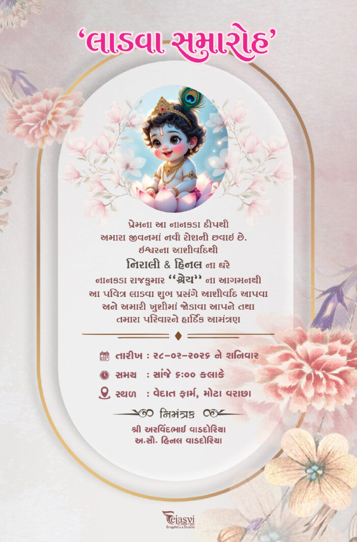 The design perfectly balances tradition and modern elegance, with divine Krishna artwork symbolizing blessings, joy, and new beginnings. The clean Gujarati typography and well-structured layout make it easy to present all event details while maintaining a premium and sophisticated look.