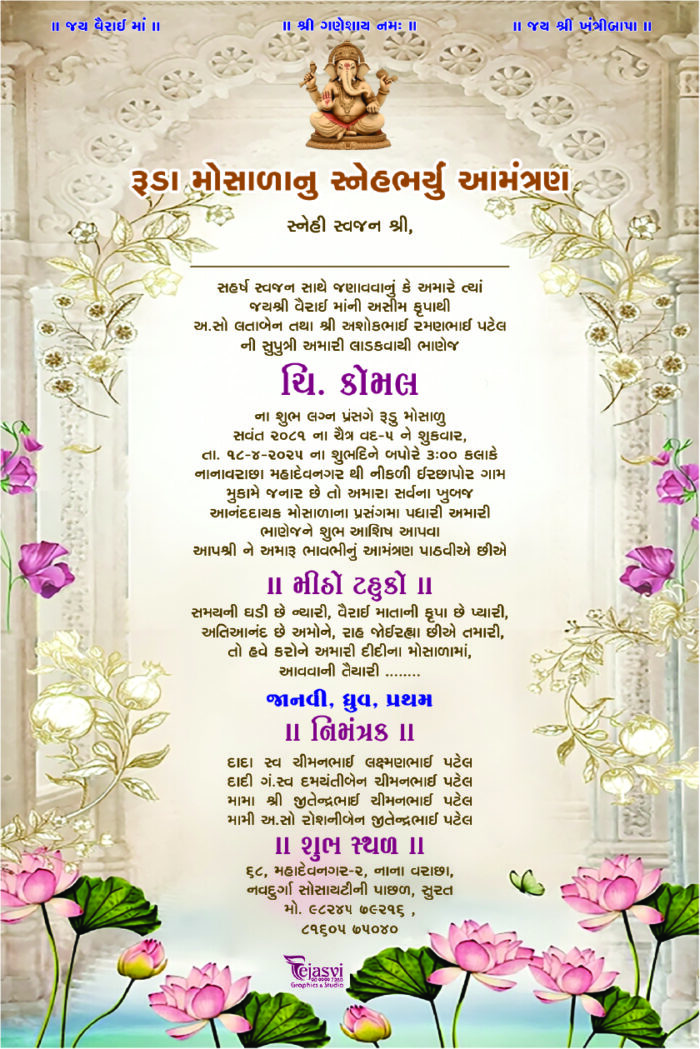 The presence of blooming lotus flowers at the base symbolizes purity and शुभता, while the delicate golden floral accents enhance the overall royal appeal. The divine blessing of Lord Ganesha at the top adds a spiritual essence, making it perfect for auspicious wedding rituals. The well-structured Gujarati typography ensures all details are presented clearly and beautifully.