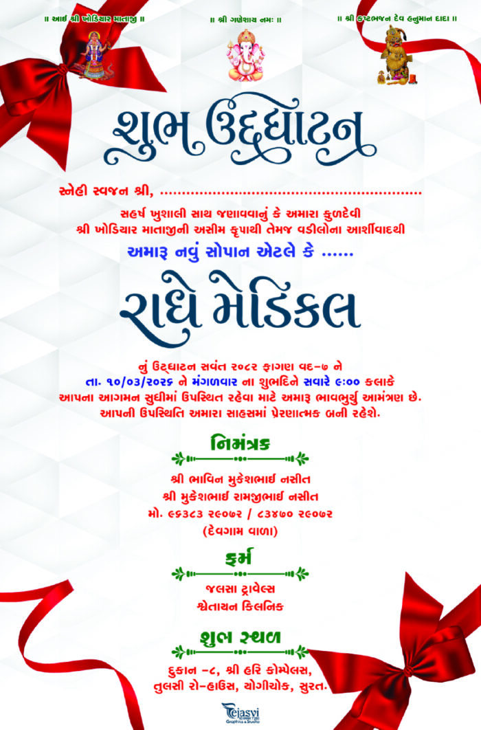 The elegant typography combined with subtle traditional touches like divine blessings adds a perfect balance of modern professionalism and cultural essence. The well-structured layout clearly presents event details, making it ideal for business openings, clinics, showrooms, or office inaugurations.