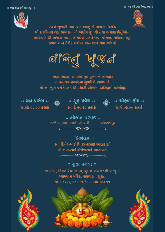 Celebrate a new beginning with this uniquely designed Vastu Pujan invitation card, featuring a modern industrial theme combined with traditional spiritual elements. The elegant dark blue background paired with golden factory illustrations symbolizes growth, success, and new ventures.