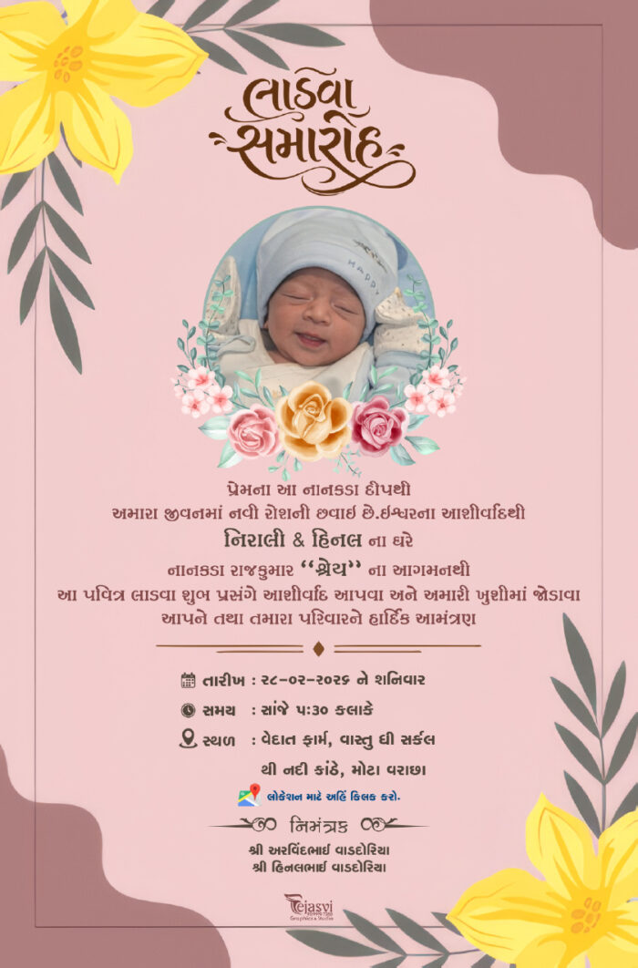 Make your baby’s naming ceremony even more special with this beautifully personalized invitation card featuring your baby’s photo. Designed with soft pastel tones, elegant floral arrangements, and a modern artistic layout, this card creates a warm and memorable impression.
