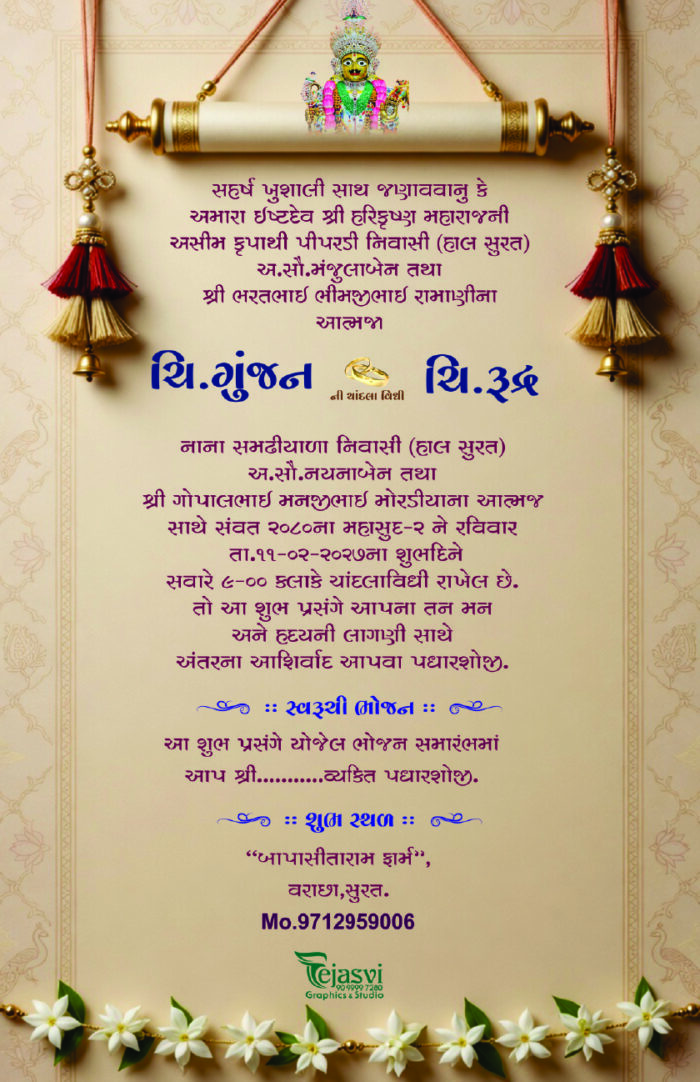 Present your special occasion with this royal Gujarati Engagement (Chandla Vidhi / Sagai) invitation design, inspired by traditional Indian aesthetics and divine elegance. This premium design beautifully combines heritage scroll elements, temple architecture, and sacred motifs, making it perfect for a culturally rich and graceful celebration.