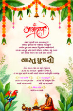 Welcome your loved ones to a शुभ Vastu Pujan ceremony with this beautifully designed invitation card featuring a vibrant floral toran and tropical greenery theme. Adorned with marigold garlands, mango leaves, and hanging bells, the design reflects traditional Indian décor with a fresh and lively touch.