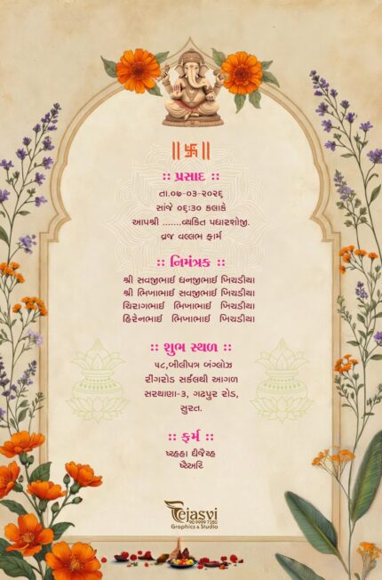 Crafting a digital invitation in English for a Gujarati wedding, highlighting a beautiful floral theme with shades of enchanting pink.  01