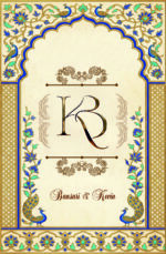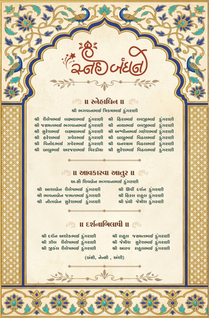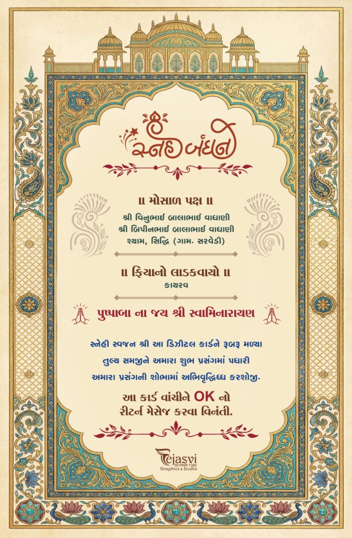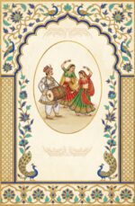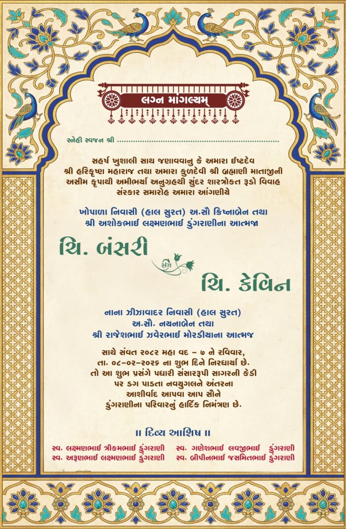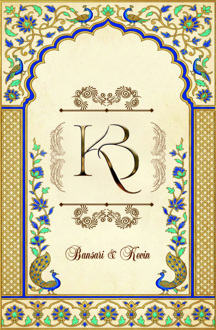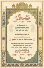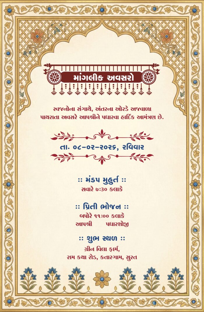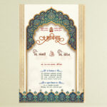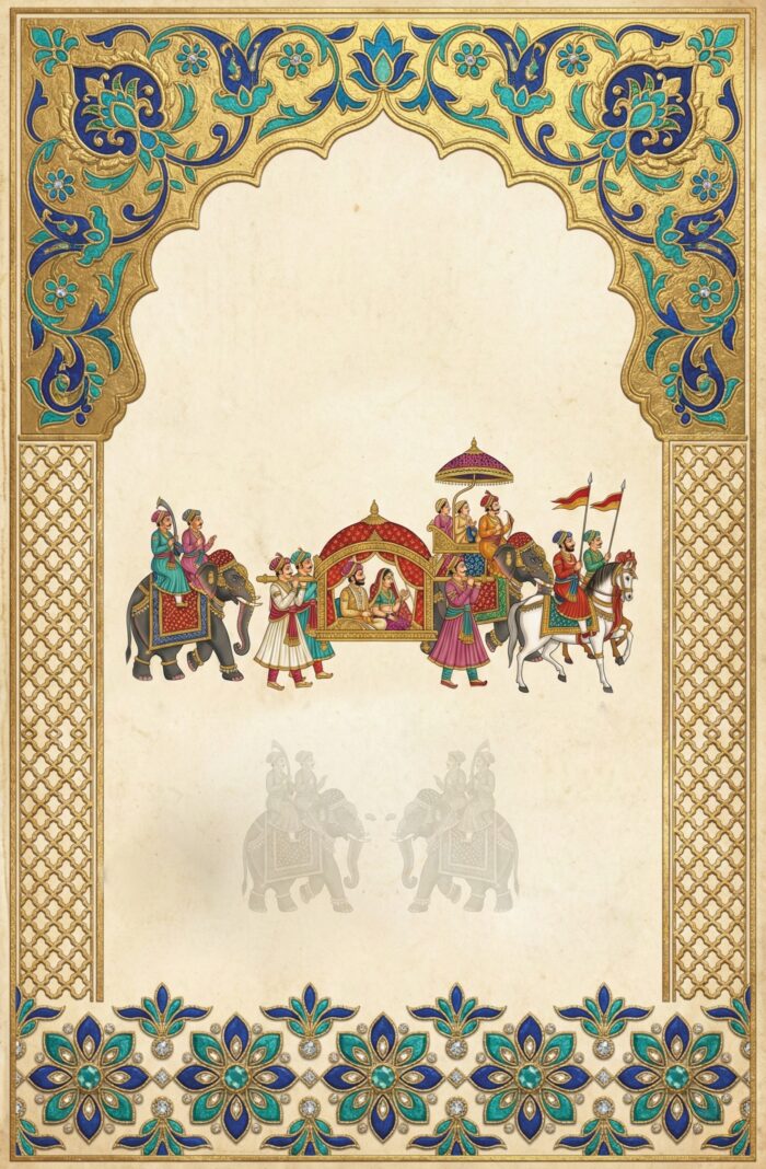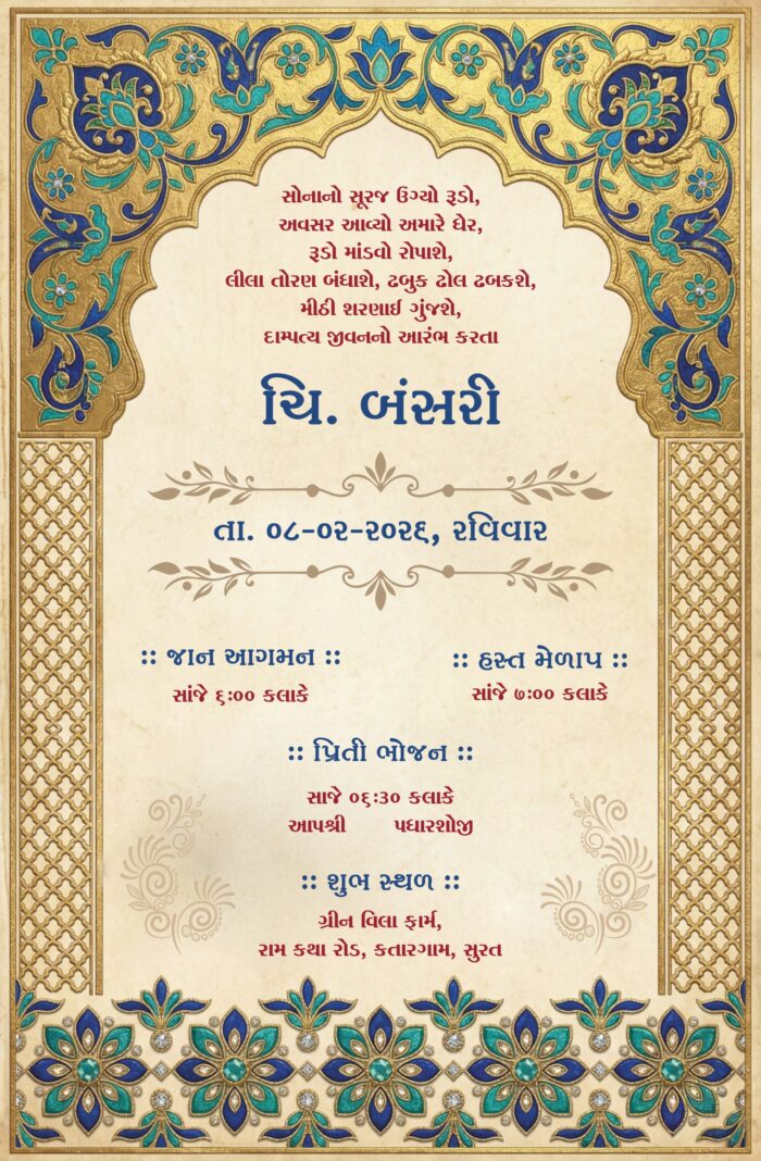 This image depicts a traditional Indian wedding invitation card designed in an elegant and royal style. The card features a graceful arch-shaped frame at the top, richly decorated with intricate floral and ornamental patterns in deep blue and gold tones, symbolizing grandeur and tradition.