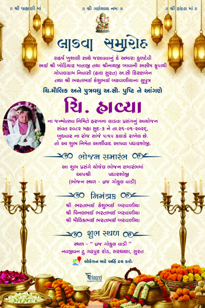 The inclusion of a baby photo adds a personal touch, while the structured Gujarati typography neatly presents all event details. The combination of cultural richness and royal styling makes this card perfect for traditional family celebrations filled with joy and blessings.