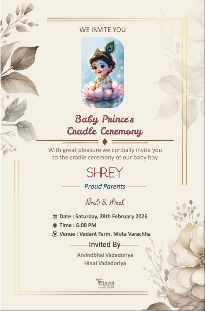 Be the first to review “Premium Minimal Baby Cradle Ceremony Invitation Card with Krishna & Beige Floral Theme LADVA2026008” Cancel reply